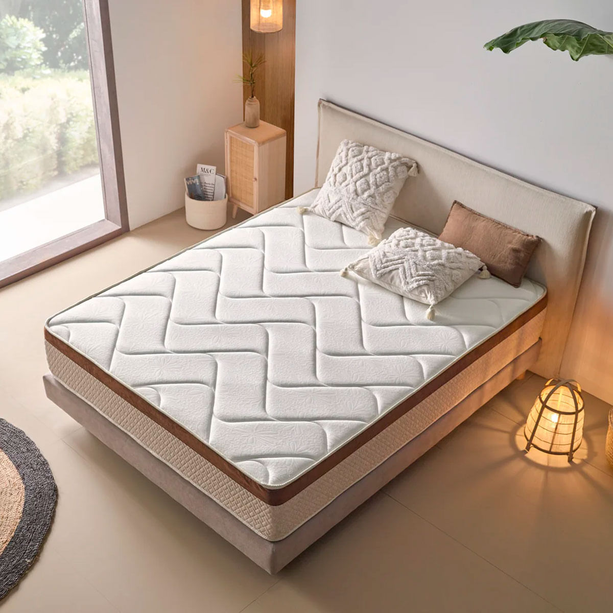 Incorpora tecnología de viscografeno, que combina la adaptabilidad de la viscoelástica con la conductividad térmica del grafeno, asegurando un confort térmico óptimo. Además, su efecto ionizante contribuye a un entorno de descanso limpio y revitalizante. El colchón cuenta con un acolchado superior de 2 cm de supersoft para una acogida suave y cómoda, mientras que su acolchado inferior de tejido 3D de alta ventilación facilita la circulación del aire, manteniendo el colchón siempre fresco y seco.