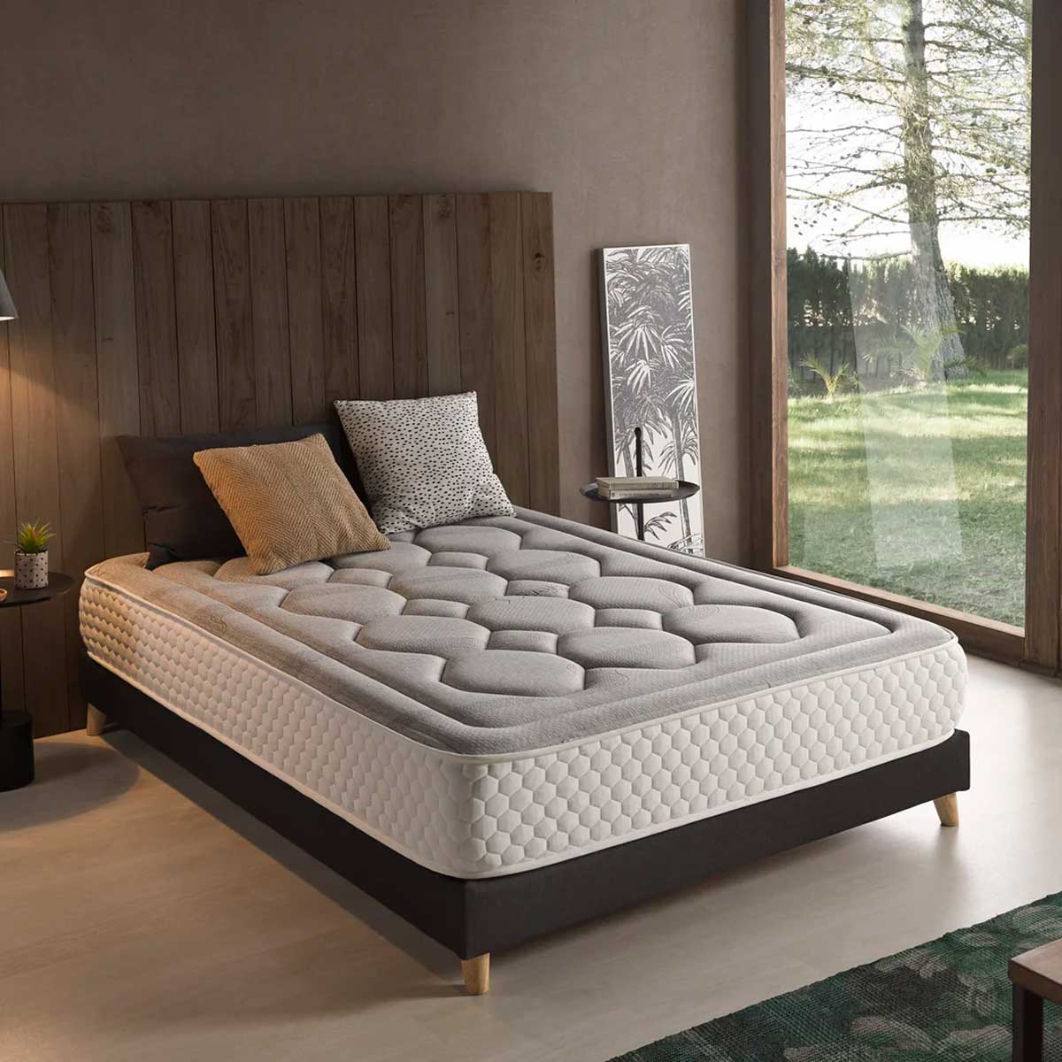 El colchón está diseñado con un acolchado superior de 5 cm de visco Natur Grafeno + supersoft, que proporciona una acogida cómoda y un regulador térmico para mantener una temperatura óptima durante el sueño. El acolchado inferior incluye tejido tridimensional 3D Air Fresh en gris, que garantiza una alta ventilación y frescura constante.