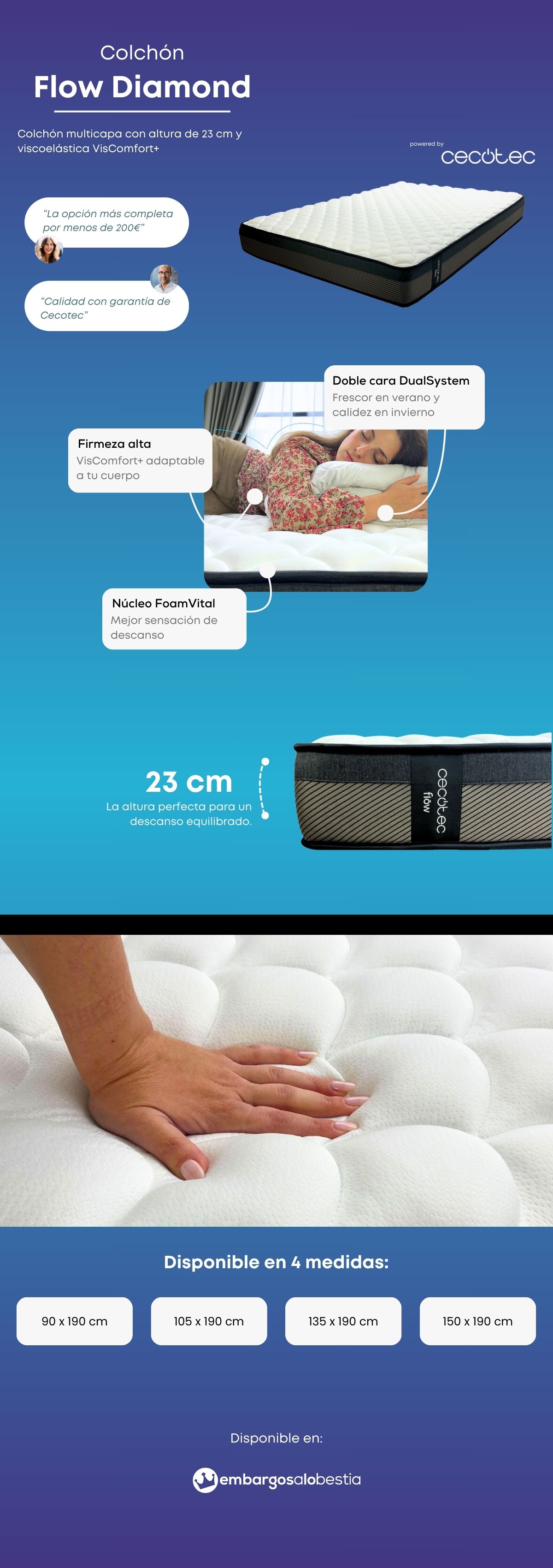 Descubre el placer de un descanso reparador con el colchón Flow Diamond de Cecotec, diseñado para ofrecerte la máxima comodidad y firmeza. Con una altura total de 23 cm y una composición multicapa, este colchón combina materiales de alta calidad para adaptarse a ti y darte el mejor descanso noche tras noche. Su capa VisComfort+ viscoelástica se adapta perfectamente a las líneas de tu cuerpo, aliviando puntos de presión y mejorando la calidad del sueño. El núcleo FoamVital proporciona la firmeza y resistencia necesarias para mantener una postura correcta durante el descanso, garantizando durabilidad y estabilidad.