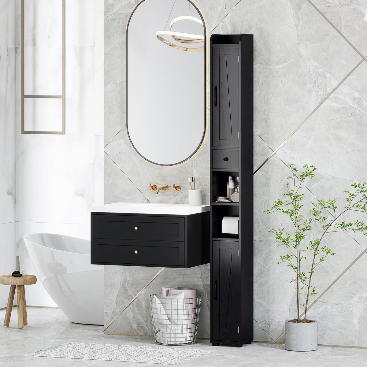 La columna de baño Homcom modelo Over está diseñada para aprovechar al máximo el espacio disponible y mantener todo en orden con un estilo atractivo. Su estructura alta y estrecha la convierte en una opción ideal para baños pequeños, integrándose sin dificultad en diferentes ambientes gracias a su acabado rústico moderno y las puertas tipo granero que aportan un aire cálido y elegante. Este mueble combina áreas abiertas y cerradas, ofreciendo múltiples posibilidades de organización. Incorpora tres estantes ajustables en altura, perfectos para adaptar el espacio según el tamaño de los objetos que se deseen guardar. Además, cuenta con dos armarios de distintos niveles, un práctico cajón y compartimentos abiertos, facilitando la disposición de productos de uso diario y artículos de higiene.