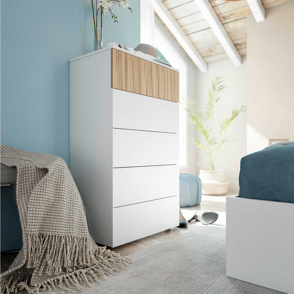 ¿Necesitas más espacio en tu dormitorio para todas tus camisetas, pantalones, o ropa de entretiempo? En ese caso no le puedes quitar el ojo a la cómoda Ethna. Está compuesta por 5 cajones, destacando el frontal del primer cajón que le aporta un toque diferente y distinguido. Gracias a su estilo moderno y colores neutros combinará a la perfección con el resto de tu decoración. Está fabricado con melamina de primera calidad, MDF y cantos de PVC, materiales muy resistentes y duraderos para que lo disfrutes mucho tiempo. Cada cajón soporta un peso total de 5kg, mientras que el mueble en total puede soportar hasta 30kg de peso. Cuenta con patas ABS ocultas por la parte inferior del mueble que evitan rayones en el suelo o que haga ruido si lo mueves. ¡Conquista de nuevo tu salón con el aparador Ethna a un precio de chollo en Embargosalobestia!