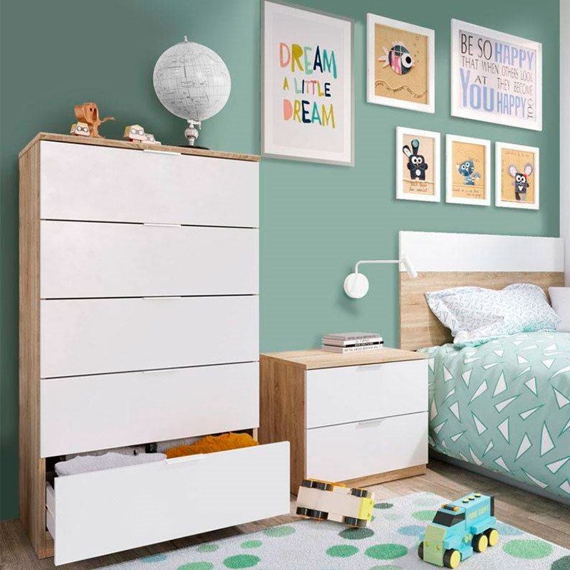 La cómoda Haya de 5 cajones te permitirá guardar una gran cantidad de ropa para lograr un dormitorio más limpio y ordenado. Está fabricada en melamina de buena calidad y combina los colores de una forma sublime. Es perfecta para guardar tanto ropa del día a día como de otras temporadas. Sus amplios cajones cuentan con tiradores de aluminio, haciéndolos más resistentes y duraderos. Compra ahora este práctico y polivalente mueble de dormitorio a un precio de chollo.