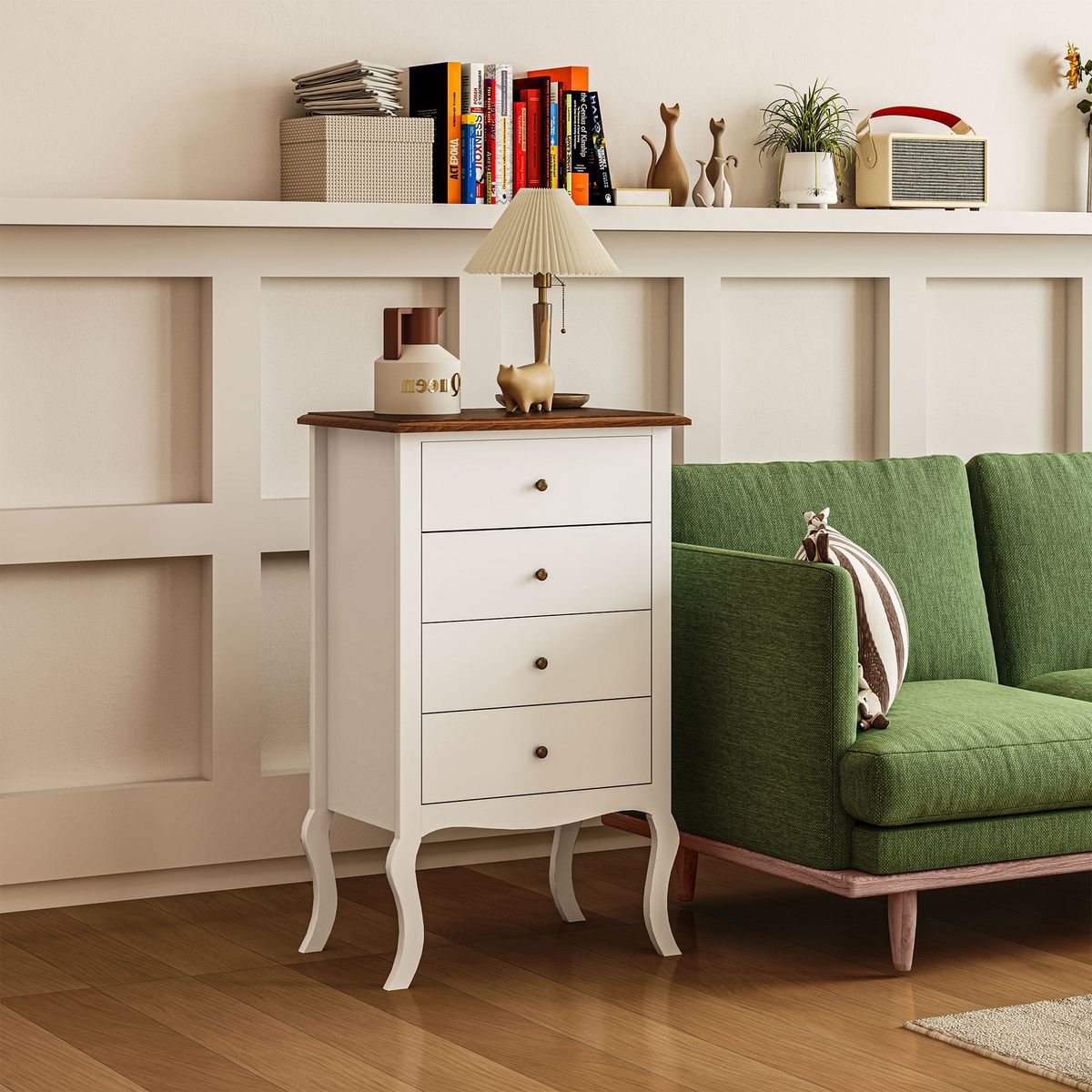 Añade un toque de distinción a tu dormitorio con la cómoda Kiwita de Homcom, un mueble que combina diseño clásico con utilidad diaria. Inspirada en el estilo francés, destaca por sus elegantes patas cabriolé y tiradores en tono bronce, que realzan su estética refinada. Su estructura en blanco con acabado de madera clara encaja fácilmente en distintos estilos decorativos, aportando un aire cálido y acogedor. Dispone de cuatro cajones espaciosos, ideales para mantener tu ropa o accesorios en orden. Cada cajón ofrece capacidad para guardar hasta cinco camisetas o tres pantalones vaqueros.
