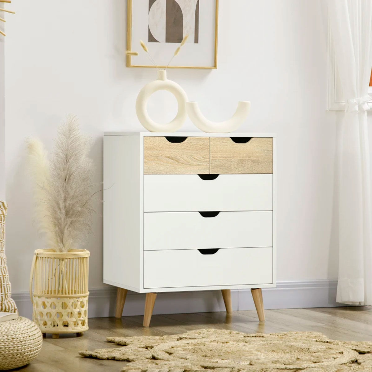 La cómoda Lisa de Homcom es el mueble perfecto para cualquier hogar. Con su diseño minimalista y su gran espacio de almacenaje, es ideal para el recibidor, el salón y el dormitorio. La cómoda está fabricada con melamina de alta calidad y madera de pino en sus patas, lo que la hace resistente y duradera. La melamina es un material resistente a la humedad y al desgaste, mientras que la madera de pino le aporta un toque de calidez y elegancia. El diseño minimalista de la cómoda Lisa le da un aspecto elegante y atemporal que combina con cualquier estilo de decoración. Las líneas rectas y sencillas de la cómoda la convierten en un mueble versátil que puede adaptarse a cualquier espacio. Cuenta con 5 cajones de diferentes tamaños, lo que te ofrece un gran espacio para guardar tus cosas. Los cajones son espaciosos y profundos, por lo que podrás guardar todo lo que necesites, desde ropa y zapatos hasta objetos de decoración. La cómoda es muy fácil de montar. Además, es fácil de limpiar con un paño húmedo. La superficie lisa de la melamina facilita la limpieza y evita la acumulación de suciedad. ¡Mantén tu hogar ordenado y organizado con la cómoda Lisa de Homcom y gana en espacio de almacenamiento extra!