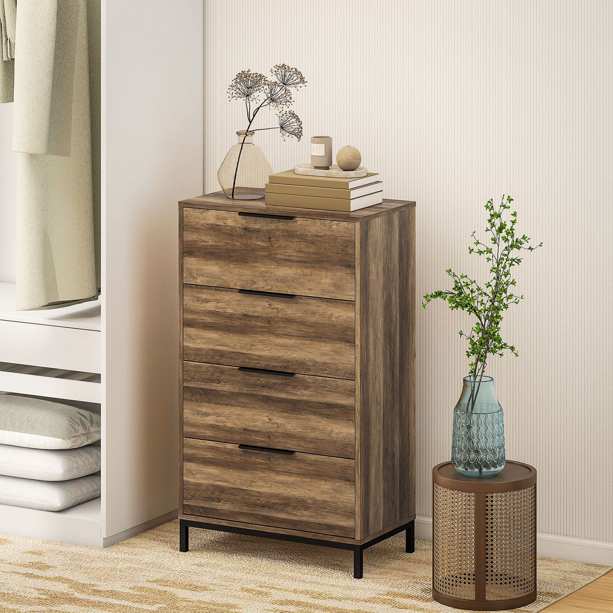 La cómoda modelo Senda de Homcom es una pieza pensada para aportar organización y estilo a tu hogar. Con un diseño actual que combina un acabado en grano de madera con tiradores negros, se convierte en un mueble versátil que se adapta fácilmente a diferentes ambientes, desde dormitorios hasta salas de estar. Su estructura alta y estrecha la hace especialmente práctica en habitaciones pequeñas o en espacios donde se busca optimizar cada rincón. Equipada con cuatro amplios cajones, ofrece una solución eficaz para mantener la ropa, accesorios u objetos personales perfectamente ordenados. Cada compartimento está diseñado para un uso cotidiano, facilitando el acceso y manteniendo todo en su lugar. Además, su base metálica con cuatro patas eleva la cómoda, aportando ligereza visual y permitiendo una limpieza más sencilla del suelo.