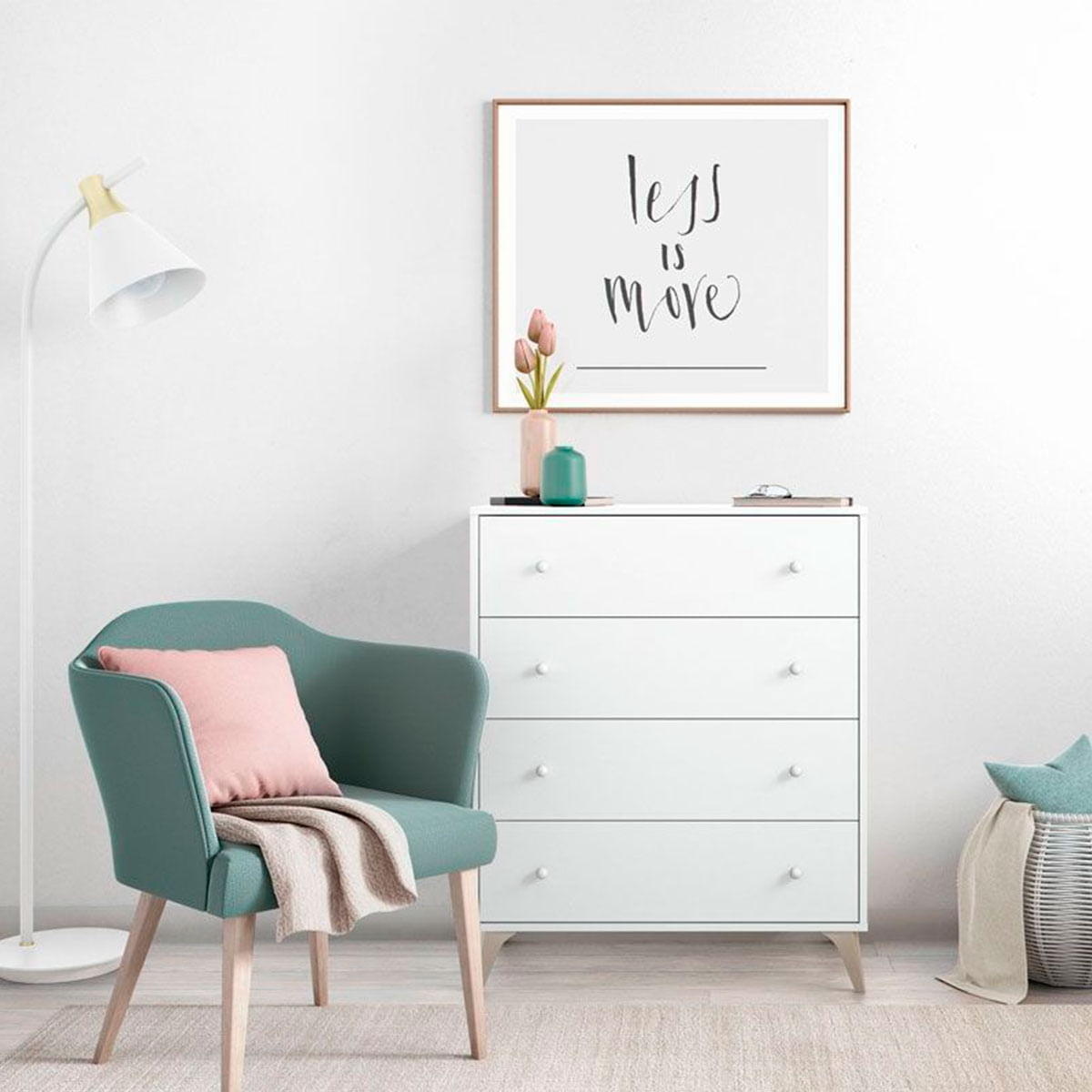 La cómoda modelo Sweet de 4 cajones es el complemento perfecto para aumentar el espacio de almacenaje de tu dormitorio. Podrás organizar desde ropa hasta accesorios o utilizarla como muebla auxiliar de oficina y organizar en ella tus documentos ¡tiene un sinfín de posibilidades! Está fabricada en tablero de partículas melaminizado, cuenta con guías correderas metálicas para hacer más fácil la apertura de los cajones, las patas son de ABS y al ser elevadas es muy sencillo limpiar por debajo del mueble. Los tiradores en forma también son de ABS y están acabado en blanco a conjunto con el resto del mueble. Gracias a su estilo nórdico de líneas sencillas quedará genial en cualquier estancia de tu hogar.