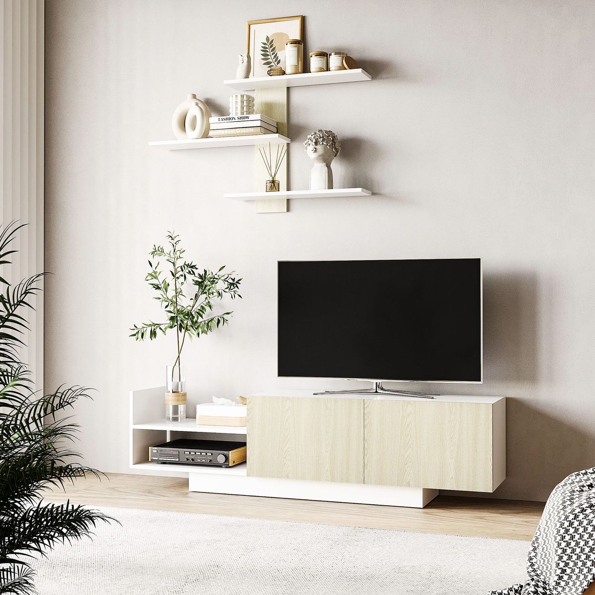 Este conjunto de salón Antares de Homcom presenta un diseño elegante y contemporáneo que transformará tu espacio vital en un santuario de estilo y funcionalidad. Con líneas geométricas suaves y tonos neutros, este conjunto se integra perfectamente en cualquier decoración interior. Construido con materiales de alta calidad, este conjunto es duradero y resistente al uso diario, asegurando que mantenga su atractivo durante años. Su amplio espacio de almacenamiento incluye 2 compartimentos cerrados con puertas batientes para mantener tus objetos fuera de la vista, así como compartimentos abiertos y tres estantes de pared para mostrar tus decoraciones favoritas y fotografías familiares. La melamina de madera utilizada en su fabricación no solo garantiza su durabilidad, sino que también le confiere un aspecto natural y elegante. Requiere un montaje sencillo, gracias a las instrucciones claras y detalladas incluidas en el paquete. Sus 3 estantes de pared ofrecen una manera elegante de exhibir tus artículos de decoración favoritos. Su diseño versátil se adapta a una amplia variedad de estilos de decoración interior. No te lo pierdas a un precio irresistible.