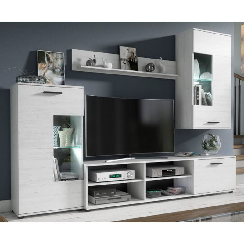 La composición de salón Antígona está compuesta por 1 mueble bajo para TV, 1 armario bodeguero, 1 módulo alto y 1 repisa superior. El conjunto está pensado para salones y comedores de tamaño mediano debido a sus 229 cm de ancho. Los muebles como el módulo superior incluyen luces LED que realzarán los objetos y elementos decorativos que quieras exponer. Fabricada en melamina de buena calidad, la composición tiene un estilo nórdico y combinará fácilmente con el resto de mobiliario. Se trata de un conjunto muy práctico que te permitirá guardar una gran cantidad de objetos para disfrutar de una estancia más ordenada y estética. No esperes más, hazte ahora con esta magnífica composición Antígona a un precio a lo bestia.