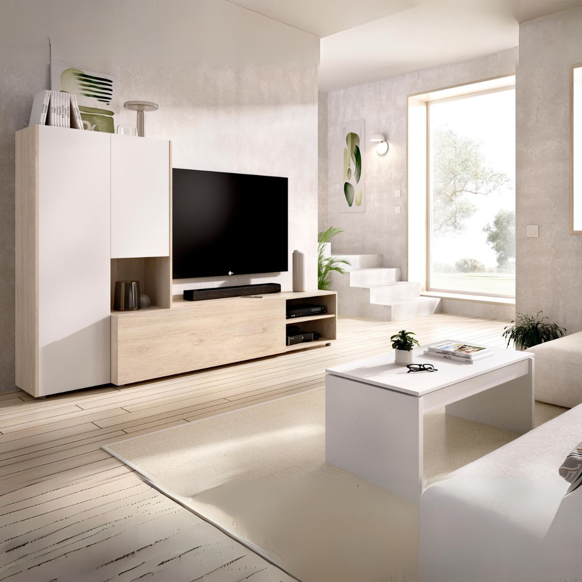 Es el momento de decorar tu salón con esta encantadora composición de salón modelo Kei formada por un mueble bajo de TV y un módulo lateral reversible. Combina practicidad y estilo con esta composición modelo Kei. Su mueble bajo formado por 2 compartimentos abiertos y 1 puerta abatible ideal para guardar y exhibir tus decoraciones y dispositivos electrónicos. Por otro lado, el modulo alto lateral cuenta con 2 puertas batientes en color blanco y diferentes estantes en su interior para almacenar todo aquello que quieras ocultar, desde vajilla hasta libros. Su diseño es reversible por lo que podrás instalar el modulo lateral en uno u otro lado en función de tus gustos y de la disposición del salón.