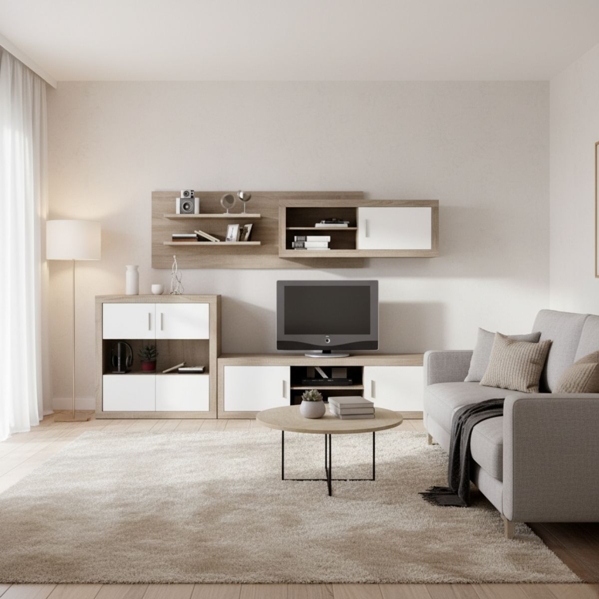 Con la composición de salón modelo Lara, tu sala ganará en estilo y elegancia. Está formada por tres piezas: un mueble de televisión, un aparador y un módulo superior con estantes y armarios. Su mayor ventaja es la gran capacidad de almacenamiento que ofrece, además de las diferentes opciones de instalación que se adaptan a tus necesidades. El mueble de TV dispone de dos puertas laterales de apertura abatible con tiradores, además de dos compartimentos abiertos perfectos para ubicar dispositivos electrónicos o elementos decorativos que quieras mantener a la vista.
