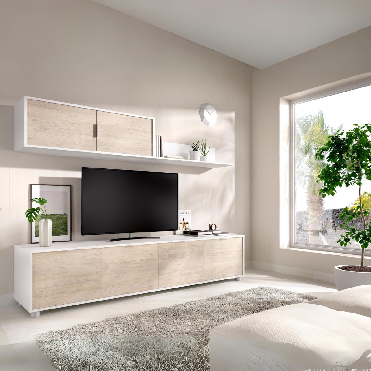 Completa ya la decoración de tu salón o sala de estar con esta maravillosa combinación modelo Lima formada por un espacioso mueble bajo de TV y un amplio y práctico módulo superior. Con esta composición dispondrás de espacio adicional para guardar cualquier objeto, desde dispositivos móviles hasta vajilla. El mueble bajo de diseño completamente cerrado está formado por una amplia superficie para situar tu televisor y 4 puertas donde tus objetos quedarán ocultos de la vista. Por otro lado, el modulo superior dispone de 2 puertas batientes y un estante mural que se integra al mismo con una gran armonía completando el conjunto. Todo el conjunto está fabricado en melamina de la más alta calidad por lo que la durabilidad y resistencia están garantizadas con la composición Lima. Consíguela ya a un precio irresistible y no te pierdas la oportunidad de completar tu salón.