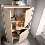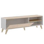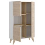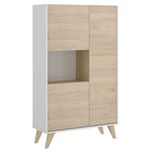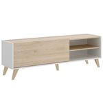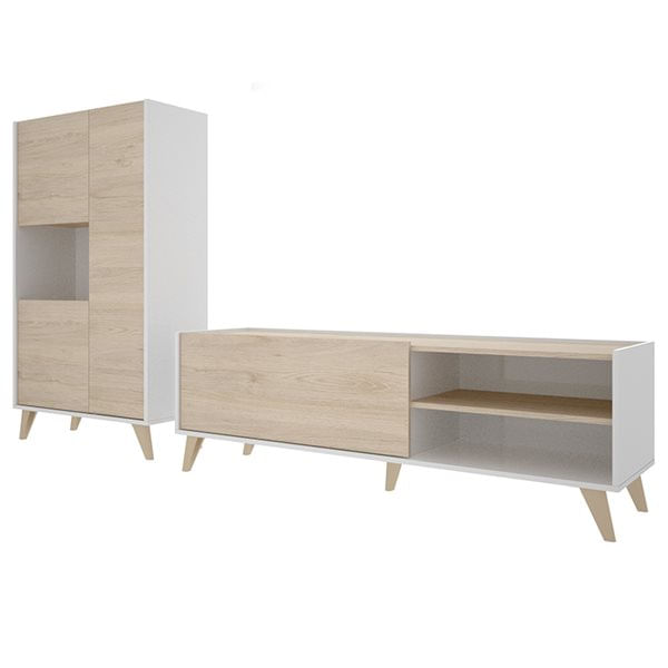 La composición de salón modelo Ness 5 viene con un mueble bajo para TV y un módulo vertical. Ambos fabricados en tablero de partículas melaminizado y sus patas son de ABS acabadas en color roble natural. Por un lado, el mueble bajo para TV de estilo nórdico es apto para televisores de hasta 65” y gracias a sus medidas y a su distribución nos proporciona el espacio suficiente para almacenar todo lo necesario, cuenta con una puerta abatible y 2 huecos y soporta un peso máximo de 50kg. Por otro lado, el módulo vertical está compuesto por 3 puertas y 4 estantes regulables en alturas que nos permitirán montarlo en 3 posiciones diferentes y cada uno soporta un peso máximo de 8kg. Ambos incluyen dispositivos de fijación a la pared para aportar mayor estabilidad y seguridad y, además, su montaje es reversible. Su estructura, sólida y consistente, nos garantiza un mueble resistente y duradero. Gracias a su diseño minimalista y a su estilo nórdico aportará mucha personalidad a tu salón.