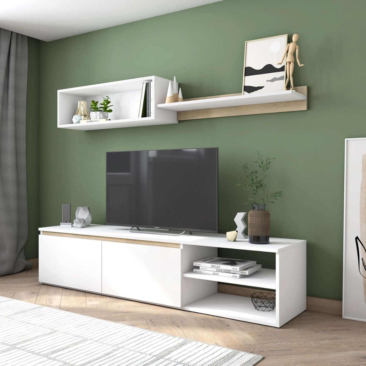 ¿Pensando en renovar tu salón para darle un aire mucho más moderno y actual a tu hogar? La composición de salón modelo Super Ego es perfecta para salones minimalistas gracias a su diseño en líneas rectas y a su combinación de colores blanco mate y Sahara. Todas las piezas están fabricadas en melamina de alta calidad y está compuesta por 1 mueble bajo para TV con armario y 2 estantes laterales y 1 módulo superior flotante con 1 hueco abierto rectangular y 1 estante. Su montaje es muy sencillo y para limpiar las piezas te recomendamos pasar un paño húmedo por su superficie.