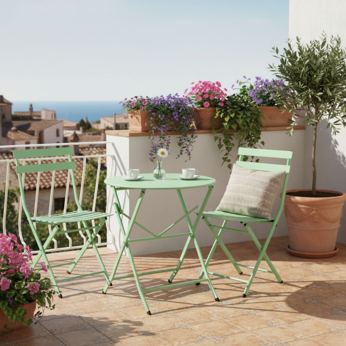 Transforma tu terraza en un rincón de comodidad y estilo con el conjunto de terraza San Martín. Este conjunto está diseñado para ofrecerte la máxima practicidad sin sacrificar el diseño y la calidad. El conjunto San Martín está compuesto por 1 mesa redonda y 2 sillas, todo fabricado con metal de la más alta calidad. La mesa, con su forma redonda, es perfecta para 2 personas, creando un espacio íntimo y acogedor para tus momentos al aire libre. Sus patas en forma de X no solo le dan un toque de elegancia, sino que también proporcionan una base sólida y estable para tus comidas y bebidas al aire libre. La practicidad es una característica fundamental de este conjunto. Tanto la mesa como las sillas son plegables, lo que significa que puedes guardarlas fácilmente cuando no las estés usando. Además, su diseño ergonómico con reposapiés garantiza que puedas relajarte cómodamente mientras disfrutas de tu terraza. El conjunto San Martín es ideal para terrazas de todos los tamaños, ya que ocupa poco espacio y se adapta a cualquier ambiente. Además, su versatilidad te permite usarlo para desayunos al sol o cenas románticas. La facilidad de limpieza es otro beneficio. Un paño húmedo es todo lo que necesitas para mantener este conjunto en perfecto estado. ¡Vive al máximo la vida al aire libre con la composición de terraza San Martín!