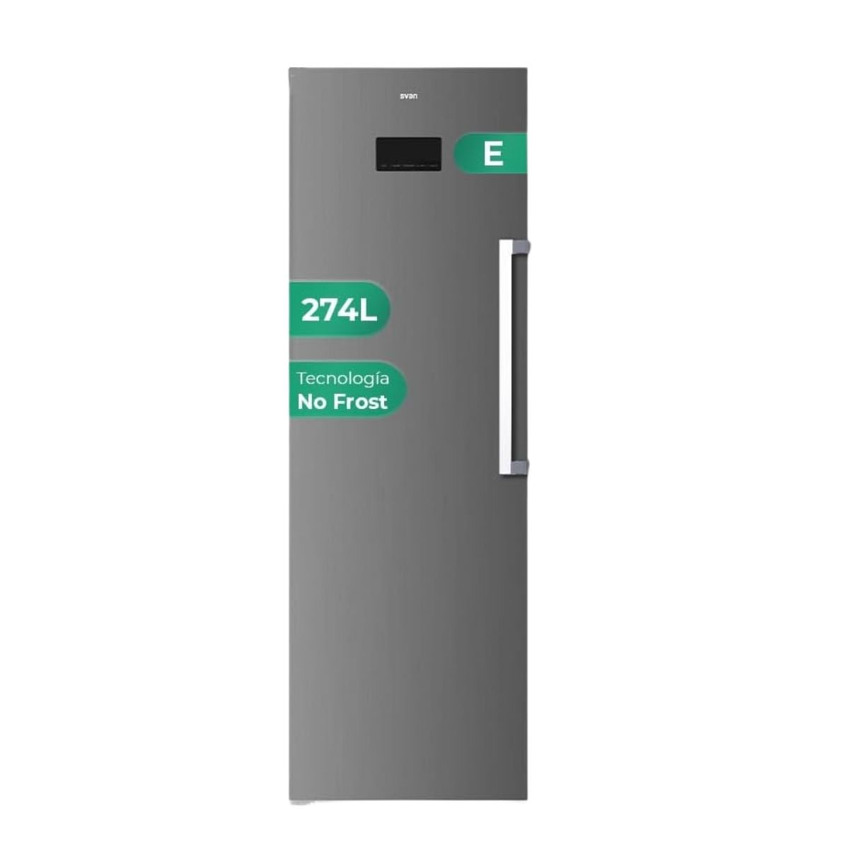 El congelador vertical Svan modelo SCV185601ENFD es la solución perfecta para quienes buscan máxima capacidad, eficiencia y diseño funcional en un solo electrodoméstico. Gracias a su tecnología No Frost, te olvidas de la escarcha y del hielo, manteniendo los alimentos perfectamente conservados sin esfuerzo. Incorpora motor Inverter con gas R600a que optimiza el consumo energético y reduce el desgaste, logrando un funcionamiento silencioso con solo 39 dB y una eficiencia energética E pensada para un uso diario eficiente. Con una capacidad de 274L y clasificación 4 estrellas, ofrece un gran espacio de almacenaje con una distribución interna súper práctica: 3 baldas de cristal, 2 cajones, 2 balcones en puerta y 2 bandejas extraíbles que facilitan la organización de todo tipo de alimentos.
