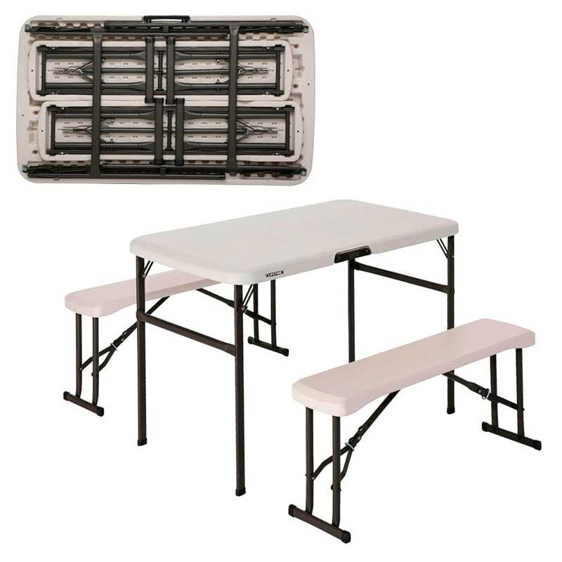 Este conjunto plegable de camping de la marca Lifetime es ideal para 4 comensales y está formado por 3 piezas independientes (2 bancos y 1 mesa), todas ellas plegables por la mitad y con asas incorporadas para transportarlas fácilmente como si fueran un maletín. Los bancos se sujetan a la mesa para facilitar su almacenamiento. Están fabricados en polietileno de alta densidad y la estructura de las patas es de tubos de acero recubierto con pintura en polvo antióxido. Todo el conjunto cuenta con protección UV, lo que evita el desgaste por la exposición al sol.