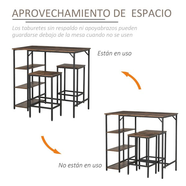 Este conjunto para cocina o comedor de Homcom, hecho de melamina de madera en color marrón rústico y estructura de metal en color negro, dará un toque distintivo allí donde lo coloques. Este conjunto de estilo industrial cuenta con una mesa alta con un lateral con estantes y dos taburetes sin respaldo ni apoyabrazos que, además de aportar mayor libertad de movimiento, nos facilita su almacenaje al poderlos guardar debajo de la mesa para ahorrar espacio cuando no estén en uso.