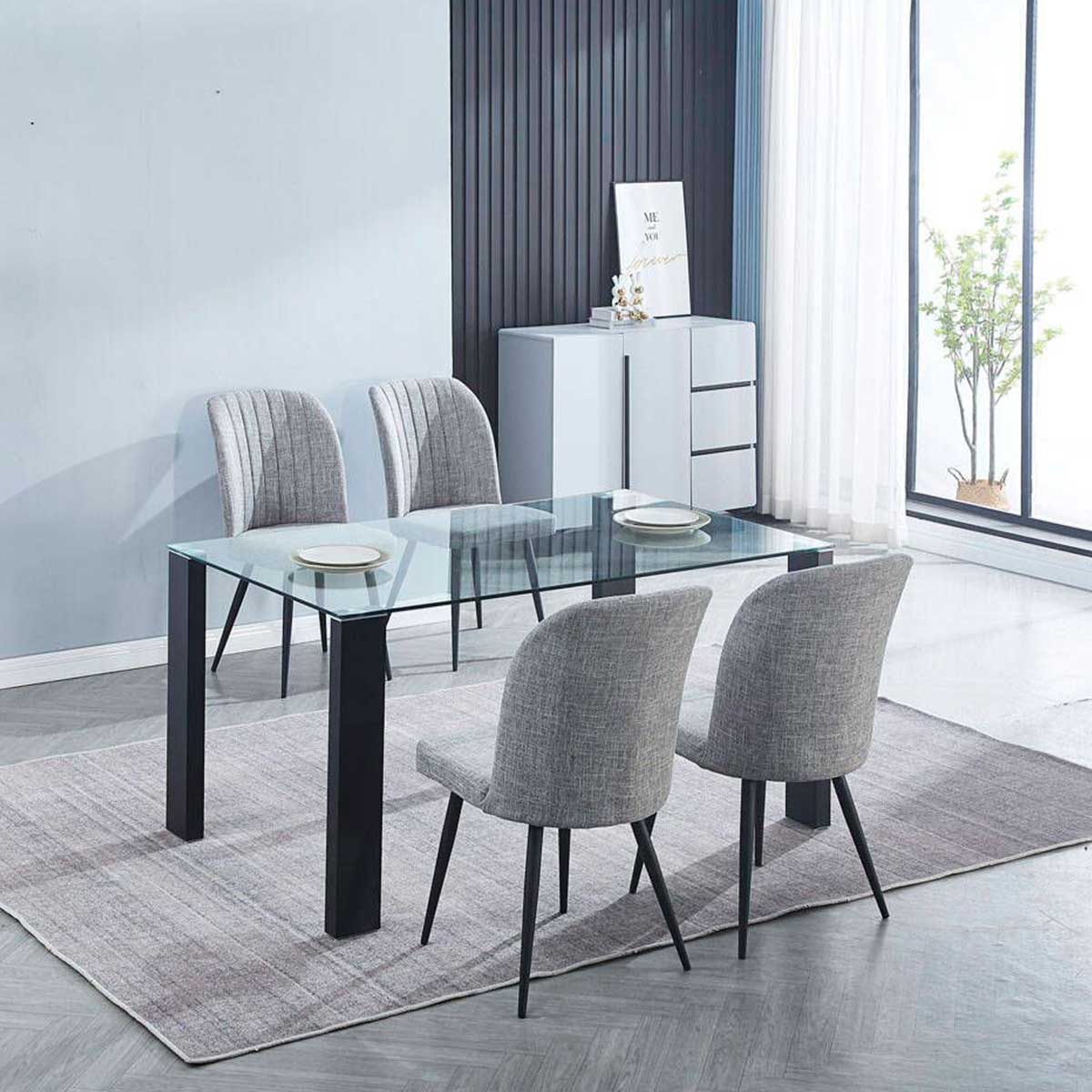 Esta maravillosa combinación para tu comedor compuesta por 1 mesa Alice con 4 sillas Rory en color gris es perfecta para darle ese toque elegante a tu salón mientras que disfrutas de la mayor de las comodidades durante tus comidas o cenas con la familia o amigos. La mesa está hecha con una estructura metálica y una superficie de cristal templado transparente muy bonita, elegante y fácil de limpiar. Por su parte, las sillas están hechas con metal, espuma acolchada y tapizadas con una bonita y elegante tela que te ofrecerá gran comodidad. Gracias a su estilo y diseño, este conjunto combinará a la perfección con cualquier tipo de decoración que tengas. ¡No esperes más para conseguir este estupendo conjunto de comedor a un precio irresistible! Sólo en Embargosalobestia