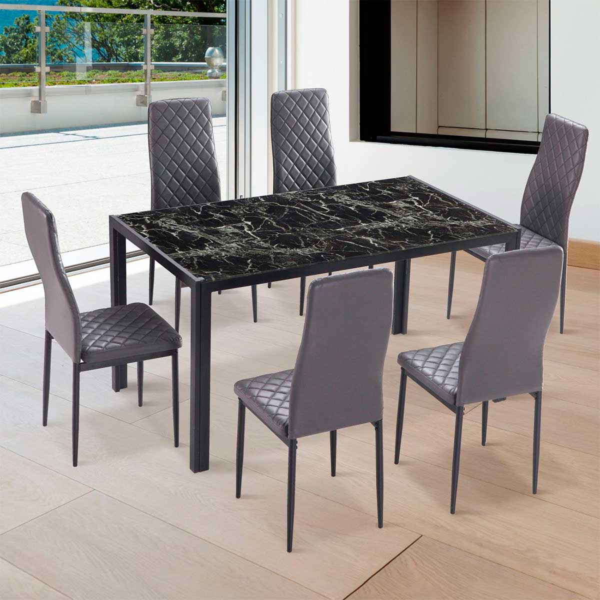 Transforma tu comedor por completo en un espacio elegante y renovado con el conjunto de comedor Mármol. Este conjunto completo hará que tu cocina, salón o comedor se vea totalmente diferente, aportando personalidad y estilo. La pieza central de este conjunto es la mesa de comedor. Su tapa de cristal con impresión de mármol no solo añade un toque rompedor, sino que también es fácil de limpiar, asegurando que tu mesa siempre brille. La estructura de metal con recubrimiento en polvo antióxido no solo es resistente y duradera, sino que también proporciona un soporte robusto y estable. Con capacidad para 6 comensales, esta mesa rectangular de posición fija es perfecta para reuniones familiares o cenas con amigos. Las 6 sillas de comedor incluidas completan este conjunto Mármol. Tapizadas en PU de alta calidad y adornadas con un diseño de costuras en forma de rombos, estas sillas no solo son estéticamente atractivas, sino también cómodas y resistentes. Con un acolchado generoso, te invitan a disfrutar de largas y agradables comidas en la mesa. Se trata de un conjunto muy fácil de montar, así como de limpiar. ¡Haz de cada comida un momento especial con el conjunto de comedor Mármol!
