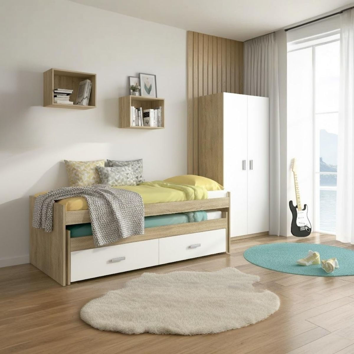 Completa el dormitorio de los jóvenes del hogar con el conjunto de dormitorio modelo Champion, ideal para crear un ambiente acogedor y atemporal. Incluye una cama nido para colchones de 90x190 cm, y una cama supletoria para colchones de 90x180 cm equipada con dos amplios cajones en la parte inferior donde podrás guardar prendas, cojines o edredones. En la pared se incorporan dos estantes flotantes, pensados para colocar libros u objetos decorativos. Para terminar el conjunto, encontrarás un armario de dos puertas con barra para colgar y un estante interior que permite organizar de forma ordenada la ropa y los accesorios. El conjunto se encuentra fabricado en melamina de madera de alta calidad, aportando resistencia y durabilidad. No dejes escapar esta oportunidad y hazte con este encantador conjunto.