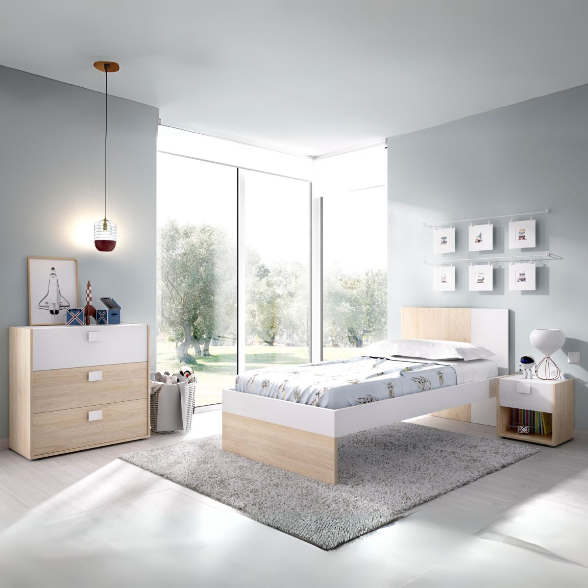 El conjunto modelo Dina Pack 3 es el conjunto perfecto para completar tu dormitorio, incluye una cama individual, una mesita de noche con un cajón y un hueco inferior y una práctica cómoda con tres cajones. Diseñado pensando en el estilo y la funcionalidad, esta cama juvenil cuenta con un cabezal bicolor que combina natural y blanco, agregando un toque de frescura y elegancia al espacio. Además, su diseño armoniza perfectamente con el resto de los muebles de la colección Dina, permitiendo una decoración cohesiva en la habitación.