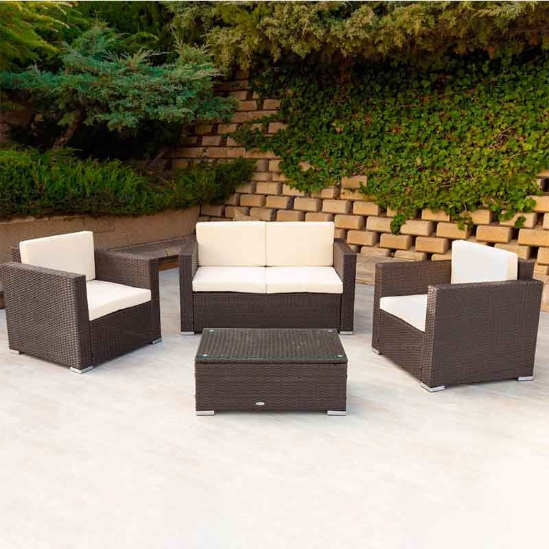 Disfruta de la zona exterior de tu hogar con este set de jardín de la marca Aktive Garden. Un conjunto de alta calidad compuesto por dos sillones, un sofá de 2 plazas y una mesita central, perfecto para reuniones con amigos o familiares, para tomar el desayuno e incluso para disfrutar de momentos de lectura y descanso al aire libre. Viene en color negro y está fabricado en ratán sintético, un material especialmente habilitado para exterior, ligero, duradero y resistente a la intemperie y al agua. Para aumentar la comodidad, el set incluye cojines acolchados para los asientos y respaldos de los sillones y le sofá en color crema que combinan a la perfección con el resto de elementos. Del mismo modo, la mesita central lleva integrado un cristal en la superficie para facilitar su limpieza.