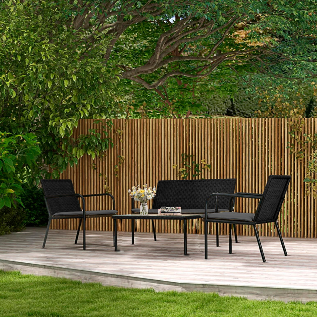 Si te encanta pasar horas al air libre y quieres comenzar a disfrutar de tu jardín o terraza, este conjunto de jardín modelo Mykonos es ideal para decorar tu espacio exterior. Formado por 2 amplios sillones individuales, un sofá de 2 plazas y una mesa de centro ideal para disfrutar del café. Es un conjunto de lo más resistente gracias a su estructura de acero, su respaldo y asiento están fabricados en un precioso ratán sintético e incluyen cojines para un acolchado suave y agradable. Ideal para 4 personas, no te pierdas este fantástico conjunto de jardín a un precio irresistible.
