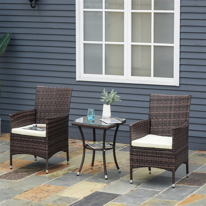 ¿Estás buscando un bonito y elegante conjunto de muebles de exterior? Te presentamos este fantástico set de muebles de jardín el cual incluye una mesa y 2 sillas, ideal para colocar en la terraza, el patio e incluso en un balcón. Está fabricado de ratán PE con un marco de hierro robusto, duradero, resistente y de alta calidad. La mesa de centro que incluye un vidrio templado con un espesor de 5 mm. Los cojines están rellenos de esponja y llevan cremallera, por lo que son lavables y extraíbles. Es un conjunto muy resistente al agua, la intemperie y a los rayos UV, por lo que no se deformará bajo el sol. La superficie de la mesa es de vidrio templado de 5 mm, dónde podrás colocar tus bebidas, revistas, libros, etc. Cuenta con un diseño moderno y elegante que combinará perfectamente con el resto de tu mobiliario. Es un conjunto totalmente funcional con el que gracias a sus medidas podrás colocarlo en cualquier rincón de tu hogar. ¡Disfruta del buen tiempo al aire libre con este fantástico set de ratán!