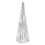 La guirnalda de luces tiene forma circular o piramidal. Presenta un entramado de nudos de plástico transparentes sobre estructura metálica plastificada especialmente resistente al calor. En su interior encontrarás 35 luces LED repartidas entre sus 57 cm de altura. Se ilumina mediante conexión eléctrica y a través de un cable de 150 cm de longitud.