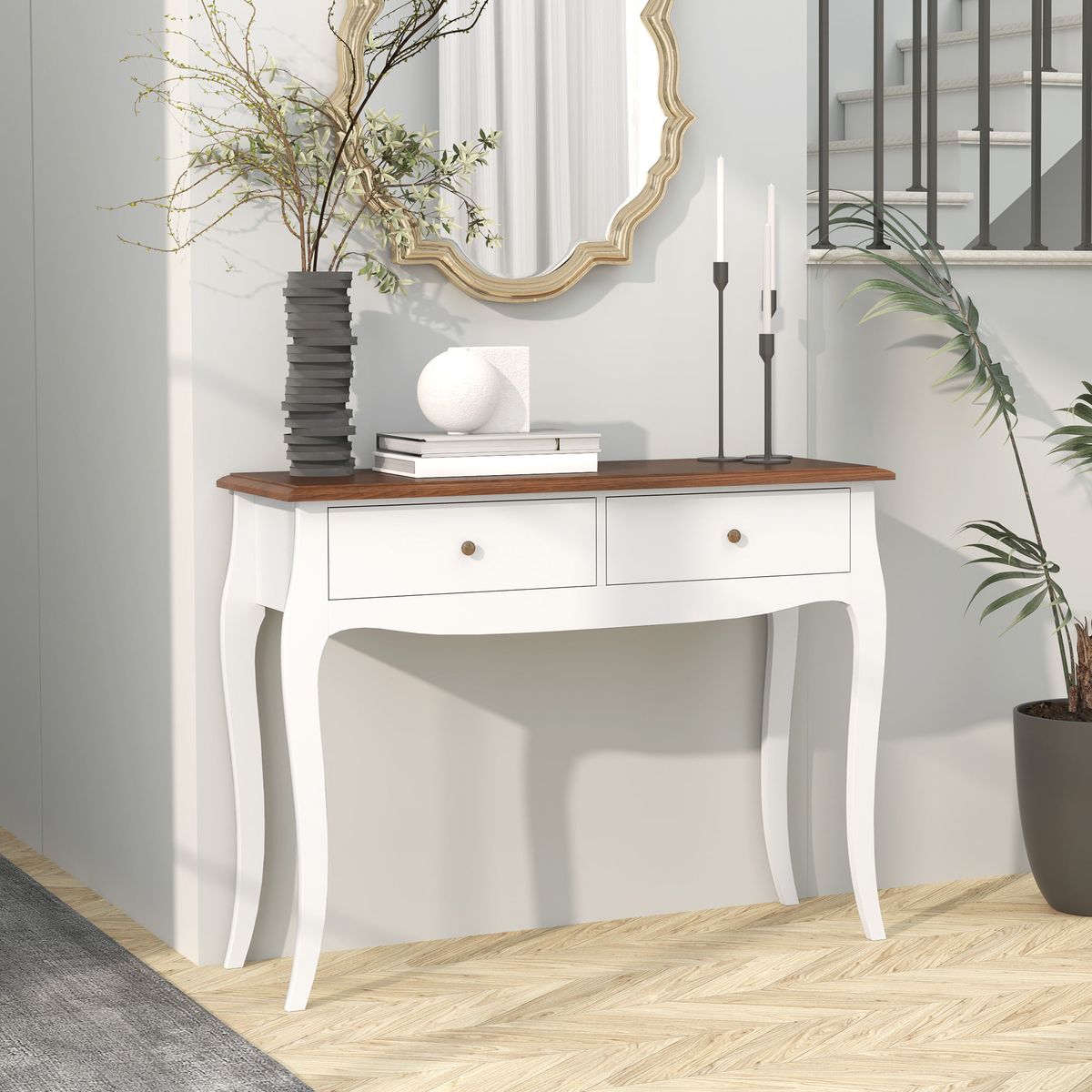 Además, cuenta con 2 cajones espaciosos equipados con rieles suaves que facilitan su apertura, perfectos para guardar objetos del día a día y mantener el orden en el recibidor, salón o dormitorio. Fabricada en MDF con recubrimiento resistente y sistema antivuelco incluido, esta consola combina diseño clásico con una estructura pensada para el uso diario. Su formato estrecho permite integrarla fácilmente en pasillos o zonas de paso sin recargar el ambiente.