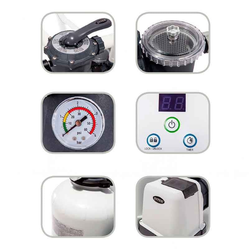 Mantendrás tu piscina siempre perfecta con la depuradora de arena de la marca Intex. Es ideal para piscinas de hasta 29100L y tiene una capacidad de filtración de 4500 litros por hora. Incorpora el sistema Hydro Aeration System y es compatible con los modelos Easy Set, Metal Frame, Prism Frame, Ultra Frame y Graphite de la marca Intex. Cuenta con un novedoso panel digital con opción de programación, bloqueo y desbloqueo. Además, viene con prefiltro exterior, 6 programas de funcionamiento y una potencia de motor de 0,25HP. Su tanque tiene una capacidad de 12kg de arena silice Nº20 o 8,5kg de arena de vidrio (no incluidas).