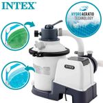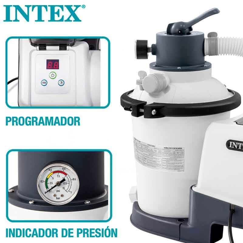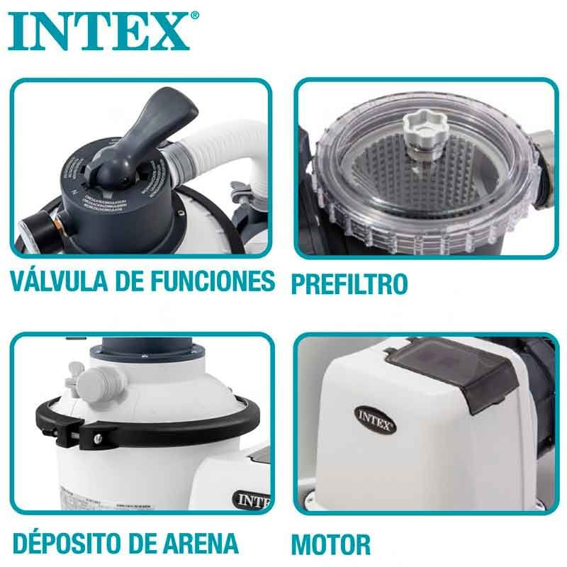 La depuradora de arena modelo Krystal Clear de la marca Intex cuenta con sistema de depuración por arena para piscinas de pequeño y mediano tamaño de hasta 17000 litros ya que su capacidad de filtración es de 3500L/h. Incorpora el sistema Hydro Aeration System y es compatible con piscinas desmontables Intex de la gama Easy Set y Metal Frame. Su tanque tiene una capacidad de 6,5kg de arena de sílice o 5kg de arena de vidrio (no incluidas). Su válvula viene con 4 funciones: lavado, filtración, recirculación y desagüe y cuenta con una potencia de motor de 90W. Además, viene con temporizador de hasta 24 horas.