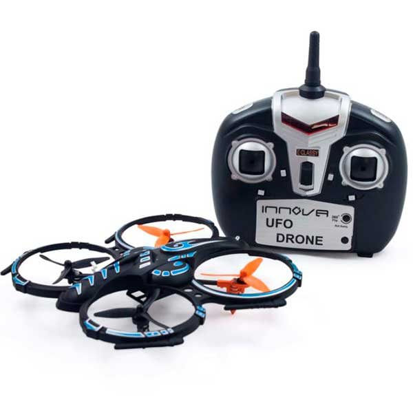 El Drone Ufo de Innova cuenta con cuatro canales y giroscopio de 6 ejes para hacer giros radicales y extremos de 360º. Con función de ajuste automático y capacidad de lanzamiento. Disfruta de sus dos modos de control. En color negro y azul con aspas naranjas.