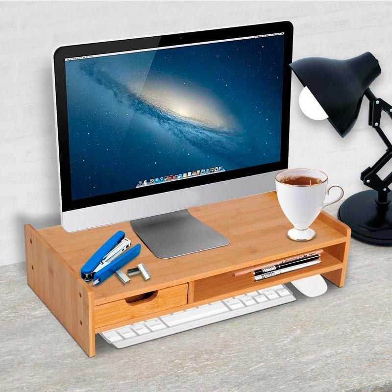 ¿Tienes la pantalla del ordenador demasiado baja? Esto puede provocar dolor cervical, dolores de espalda y estimular una mala postura. Con este elevador de pantalla de la marca Homcom podrás colocar tu pantalla en la posición deseada. También es ideal como soporte para el ordenador portátil o para la impresora. Además, ampliará el espacio de almacenaje de tu mesa de trabajo y te ayudará a tener todo más organizado gracias al cajón y al hueco abierto que incluye. Está fabricado en bambú natural que lo hace muy resistente y duradero y soporta una carga máxima de 10kg.