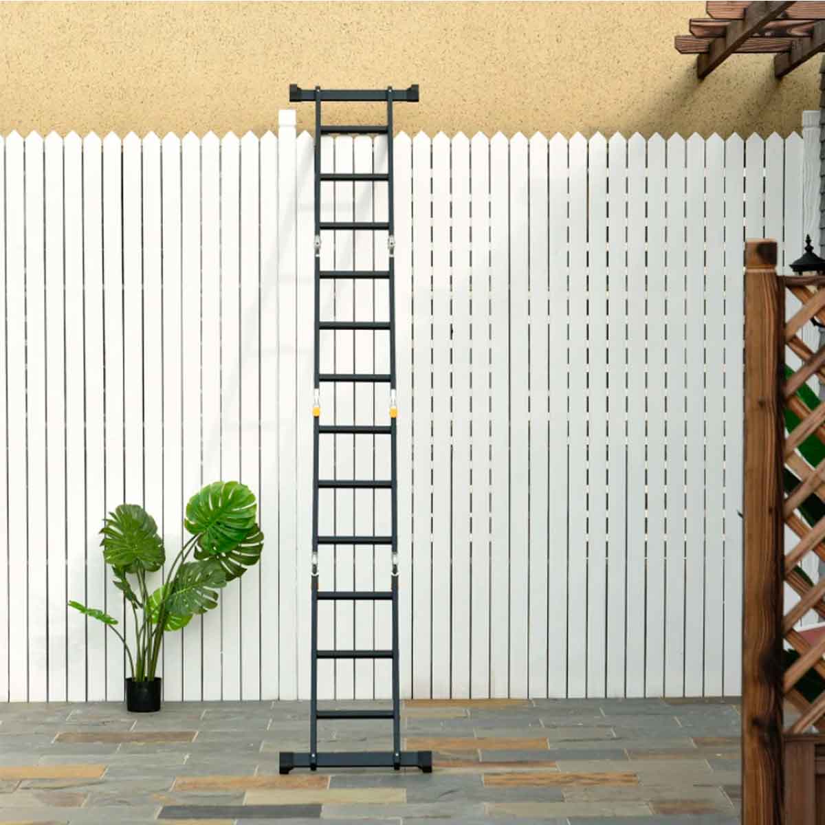 Estupenda escalera multifunción de aluminio de Homcom que adopta hasta 5 posiciones diferentes con las que se adaptará a los diferentes trabajos que realices. Podrás usarla de manera vertical totalmente extendida, la cual alcanza hasta 3,70 metros, en forma de A, de caballete, de plataforma de trabajo y en escalón. Cuando se use como andamio además, se pueden colocar 2 placas de plataforma. Es una escalera muy estable, duradera, y versátil. Está fabricada con aluminio de alta calidad, capaz de soportar hasta 150kg de peso. ¡Consíguela ya a un precio bestial!