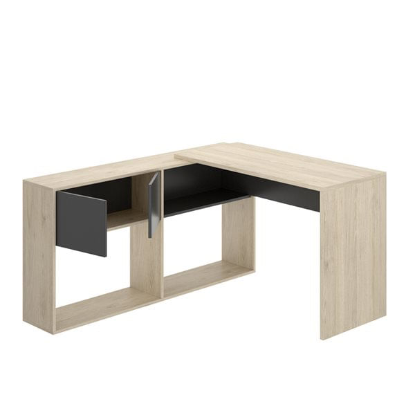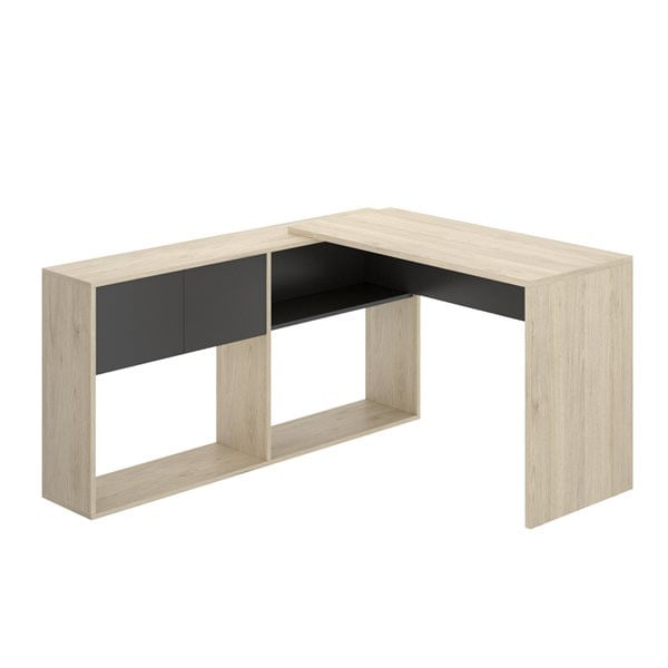 El mueble escritorio modelo Flexo B tiene un estante anexo que amplía el espacio en gran medida. El estante se posiciona de manera que se extiende la dimensión del escritorio, dotándolo de lugares múltiples para guardar diferentes objetos. En este modelo el estante se ubica de forma horizontal, con los módulos con puertas en un costado. La superficie del escritorio es muy robusta, lo suficiente para colocar un ordenador convencional y algunos objetos más, todo sin problemas.