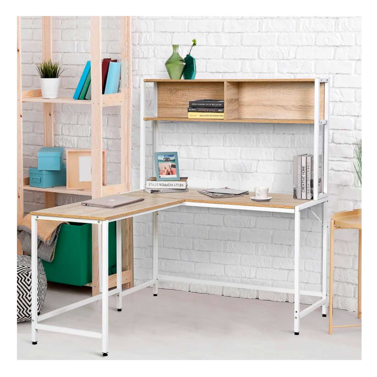 Este estupendo escritorio de Homcom con diseño en forma de L te sorprenderá por su funcionalidad y te encantará por su diseño elegante. Cuenta con doble superficie de trabajo, posicionados en esquina, y unos estantes incorporados para que puedas trabajar con tu ordenador o portátil en una zona, mientras que en la otra puedes poner la impresora, tus archivadores, carpetas o lo que necesites. Además, con los 2 estantes superiores podrás tener cualquier decoración que te guste, como plantas, fotos, o material de oficina. Para mayor seguridad, cuenta con patas antideslizantes, evitando también ralladuras en el suelo. Gracias a su combinación de colores, combinará a la perfección con el resto de tu decoración. ¡Consigue ya tu escritorio en Embargosalobestia.com a un precio de chollo!
