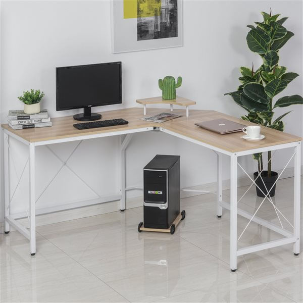 El escritorio de esquina para ordenador de Homcom es la mesa de trabajo o estudio perfecta tanto para el hogar como para la oficina. Para trabajar, estudiar o jugar con el ordenador de forma más cómoda lleva 2 complementos que te encantarán. Por un lado, incorpora un estante para la pantalla del ordenador. Esto es perfecto porque tendrás una postura más cómoda y no se cargarán tus cervicales. Por otro lado, también viene con un soporte para la torre del ordenador, como es independiente podrás ponerla donde más te convenga. ¡No lo dudes y regálate el escritorio esquinero perfecto!