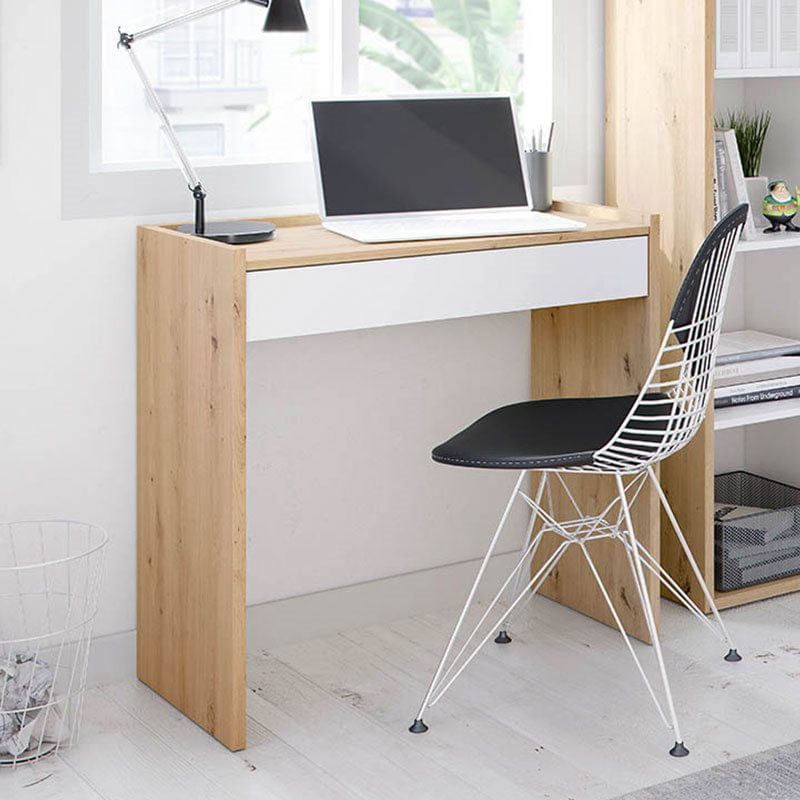 El escritorio juvenil modelo Junior es de estilo sobrio y te vendrá genial para que tus hijos empiecen a hacer sus deberes y puedan tener un espacio solo para ellos. Cuenta con un amplio cajón que supone todo el ancho del mueble y que permitirá almacenar todo tipo de libretas, lápices, colores, etc. Está fabricado con melamina de alta calidad y acabado en color roble nodi y blanco artik (mate), lo que te permitirá combinarlo con cualquier estilo decorativo fácilmente. Su montaje es muy sencillo y para limpiarlo bastará pasar un paño húmedo por su superficie.