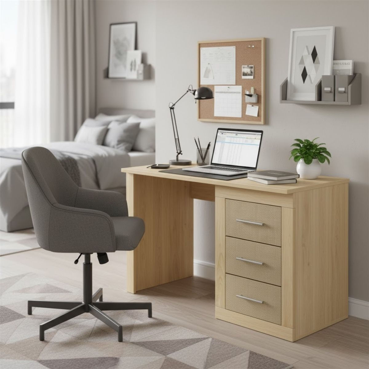 El escritorio Lara es justo lo que necesitas si buscas funcionalidad con un toque de estilo fresco y natural. Con un diseño moderno y práctico, este escritorio incluye tres amplios cajones con tirador, ideales para guardar documentos, material de oficina o cualquier cosa que quieras tener a mano y bien organizada. Su acabado en color cambria y grafito le da ese punto elegante y actual que combina fácilmente con cualquier ambiente, ya sea en casa o en la oficina.