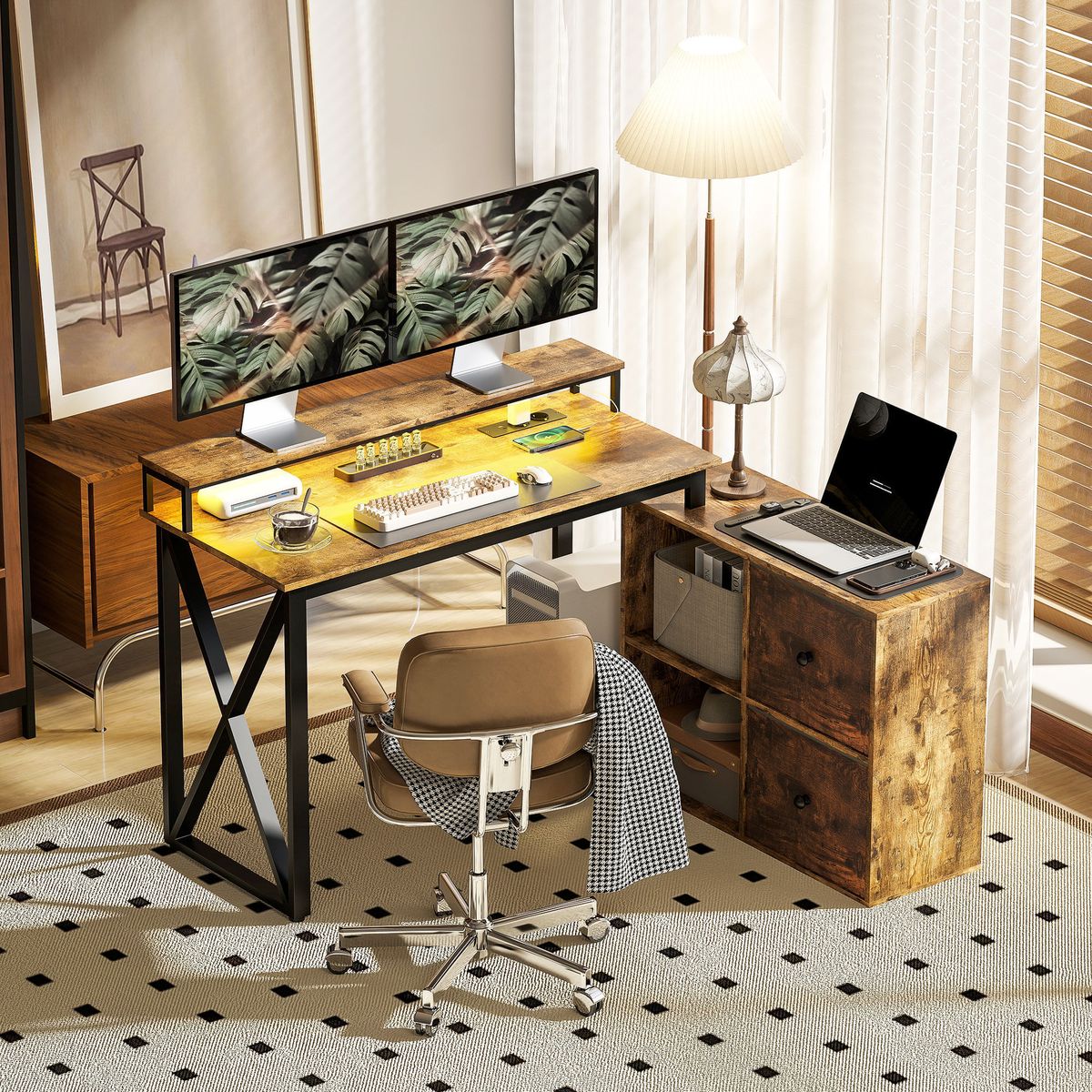 Renueva tu setup con el escritorio gaming Pigwidgeon de Homcom, una opción moderna y funcional que se adapta a tus necesidades tanto para trabajar como para jugar. Su diseño inteligente permite colocar hasta dos monitores sobre el soporte elevador, optimizando el espacio y mejorando tu postura gracias a los 10 cm de altura adicional, lo que ayuda a reducir la tensión visual durante largas sesiones frente a la pantalla. La amplia superficie de la mesa incluye dos cubos de almacenaje abiertos y cajones de tela, ideales para tener a mano todo lo que necesitas sin perder el orden. Además, cuenta con una estación de carga integrada con puertos USB y tipo-C, junto a un cable de 2 metros, para que tus dispositivos estén siempre listos para usarse sin depender de enchufes adicionales.