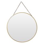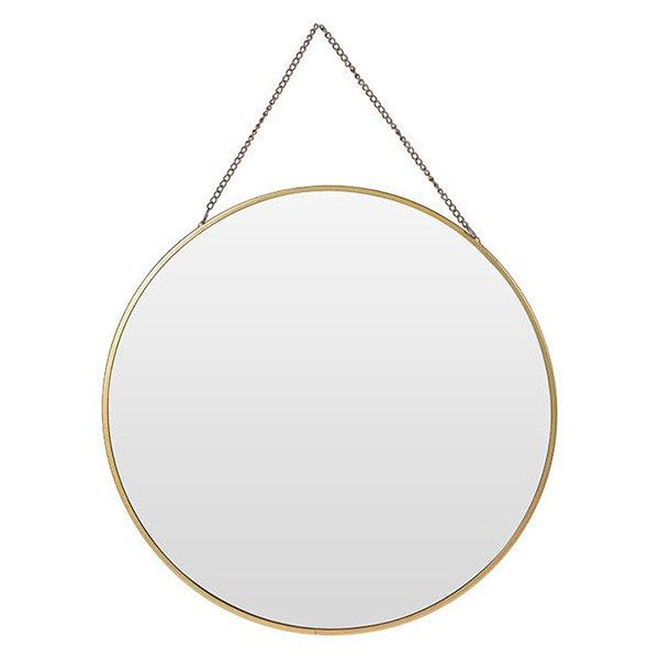 Este espejo de pared redondo de 39 cm de diámetro es perfecto para vestir cualquier pared de tu casa. Su estilo es sencillo y tienen un toque industrial, tan de moda en la decoración actual. El marco metálico dorado es mínimo dando todo el protagonismo al espejo. Cuenta con un colgador de cadena que le da un aspecto desenfadado.