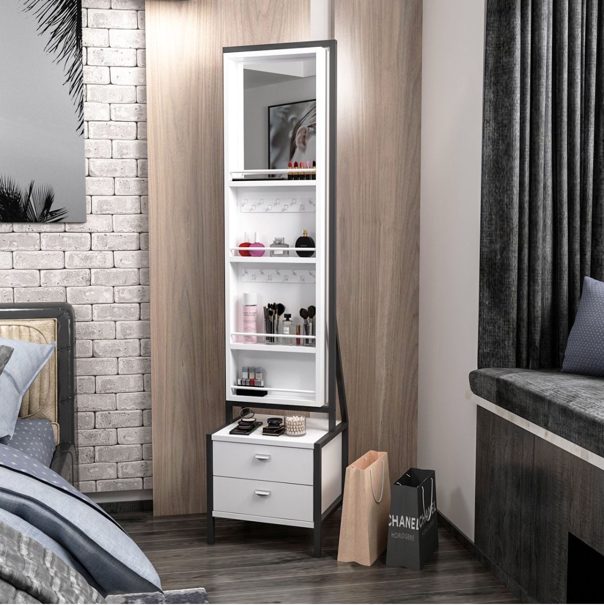 Si buscas una solución práctica para tener tus joyas y accesorios bien organizados, el espejo joyero modelo Mocca es una opción muy completa. Cuenta con dos cajones en la parte inferior y una puerta abatible con espejo que oculta un amplio espacio de almacenamiento en su interior. Dentro encontrarás cuatro estantes equipados con barras de seguridad que evitan que los objetos se desplacen o caigan. Además, incluye varios ganchos diseñados para colgar collares, pendientes, anillos u otros complementos, lo que facilita mantener todo en orden y siempre a mano. El espejo exterior no solo es funcional para revisar tu imagen antes de salir de casa, sino que también es orientable, lo que te permite ajustarlo según tus necesidades o preferencias. Este diseño versátil y bien distribuido convierte al modelo Mocca en un mueble práctico y decorativo, ideal para dormitorios o vestidores.