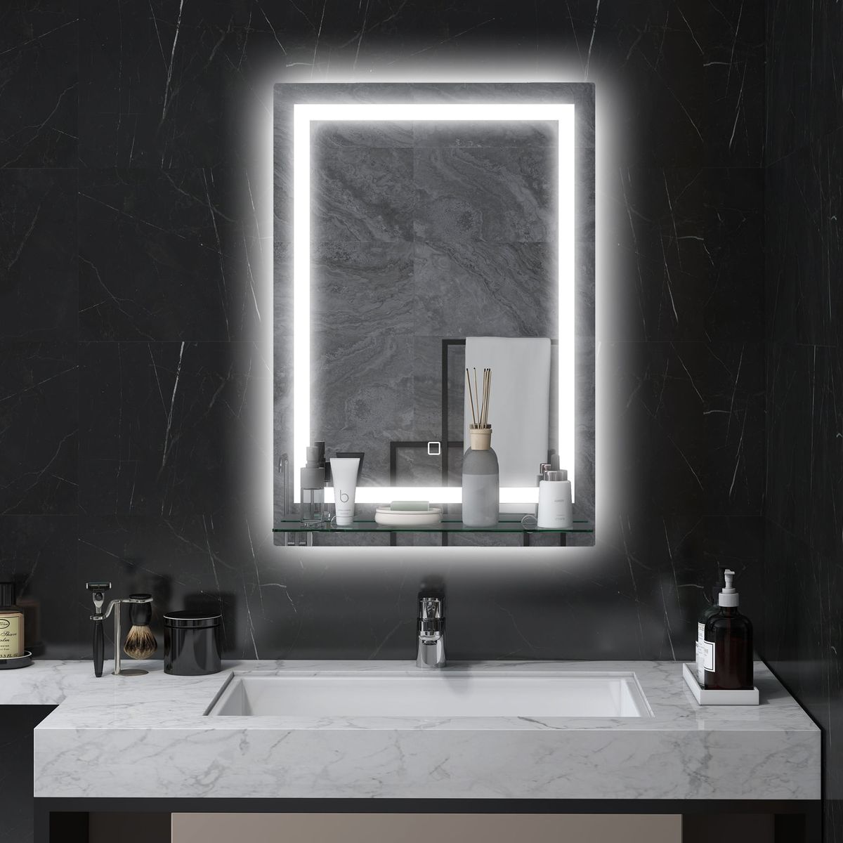 Fabricado con un marco de aluminio resistente a la corrosión, está pensado para soportar la humedad de ambientes como el baño, y cuenta con certificación IP44 que garantiza seguridad y durabilidad en zonas húmedas. Su superficie de vidrio de 4 mm asegura una imagen nítida y clara, mientras que el estante integrado de cristal ofrece un espacio práctico para organizar artículos esenciales de higiene o maquillaje, manteniendo todo al alcance de la mano. Con unas medidas compactas y un montaje sencillo que incluye manual e instrucciones, el espejo Coral se adapta fácilmente a la pared sin complicaciones. Su potencia de 20 W proporciona una iluminación eficiente sin un consumo elevado, destacando por su diseño inteligente y actual. El espejo Coral de Kleankin no solo mejora la estética del baño, sino que también aporta funcionalidad y comodidad, convirtiéndose en un elemento clave para un entorno moderno y organizado.