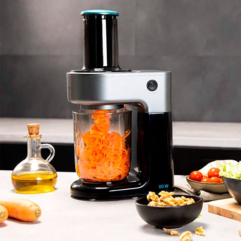 Si eres un/a fanático/a de las frutas y verduras y te encanta incorporarlas a tus platos, no te puedes perder este práctico espiralizador eléctrico SpiralChef 400 de Cecotec. Se trata de un cómodo electrodoméstico de 80W de potencia que incluye 4 tipos de cuchillas de acero inoxidable intercambiables en función de lo que se desee: capellini, espagueti, tagliatelle y pappardelle. El recipiente tiene 1L de capacidad y es muy fácil de usar y de limpiar. No te pierdas este magnífico espiralizador de frutas y verduras y dale un toque más divertido y apetecible a tus platos.
