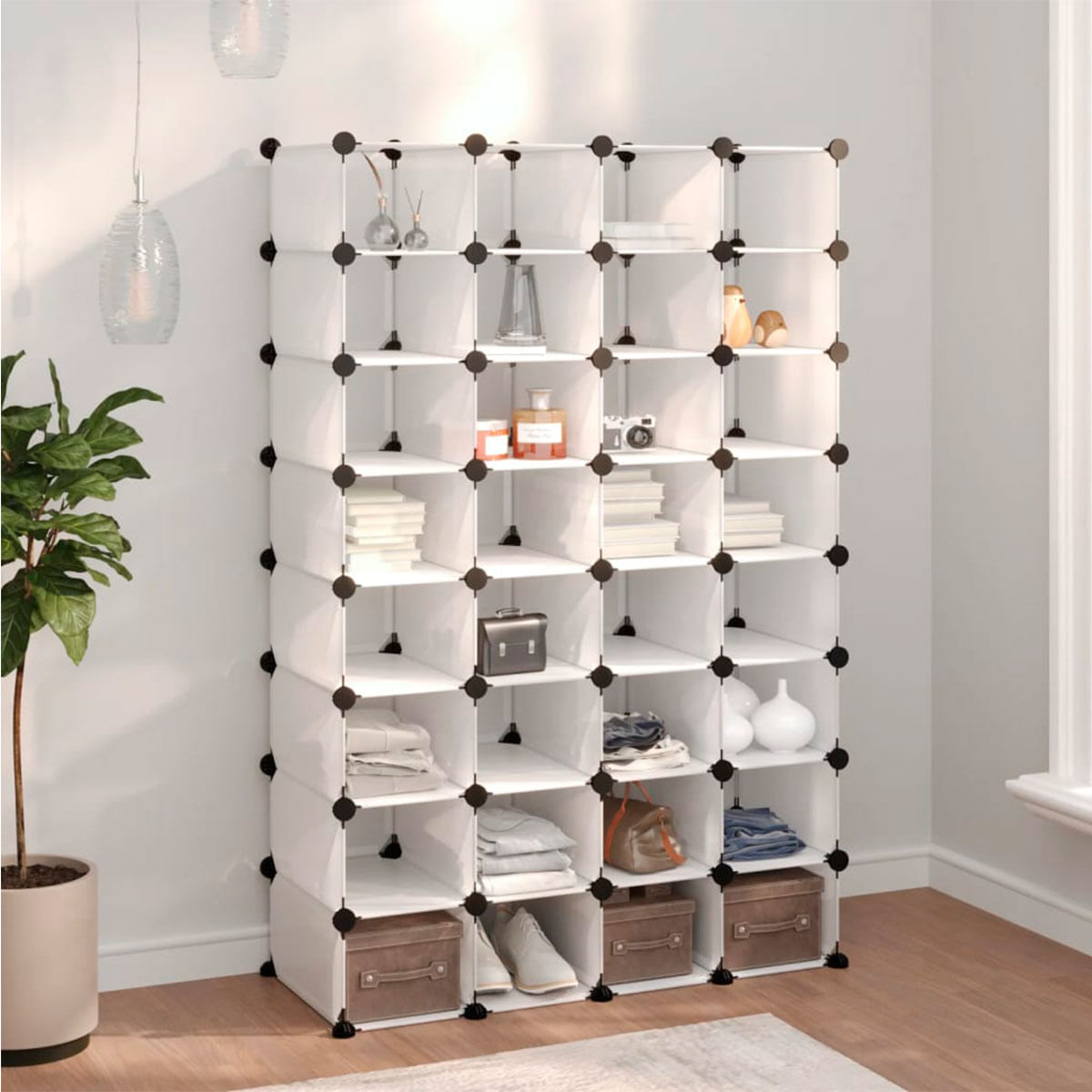 Esta original estantería te llamará la atención por su tamaño y estilo. Cuenta con un total de 32 compartimentos en los que podrás guardar, por ejemplo, hasta 32 pares de zapatos, con un gran espacio de almacenaje y una capacidad de carga máxima de 10kg cada uno. No tienes por qué guardar zapatos únicamente, también puedes usar varios compartimentos para elementos decorativos o para alguna caja de almacenamiento con documentación o cualquier cosa que necesites en su interior. Está fabricado con acero y PP, materiales muy resistentes y duraderos. Al estar fabricado con PP, es impermeable y apenas necesita mantenimiento. Es muy fácil de usar, limpiar y montar. ¡Consigue todo ese espacio de almacenaje extra a un precio de chollo en Embargosalobestia!