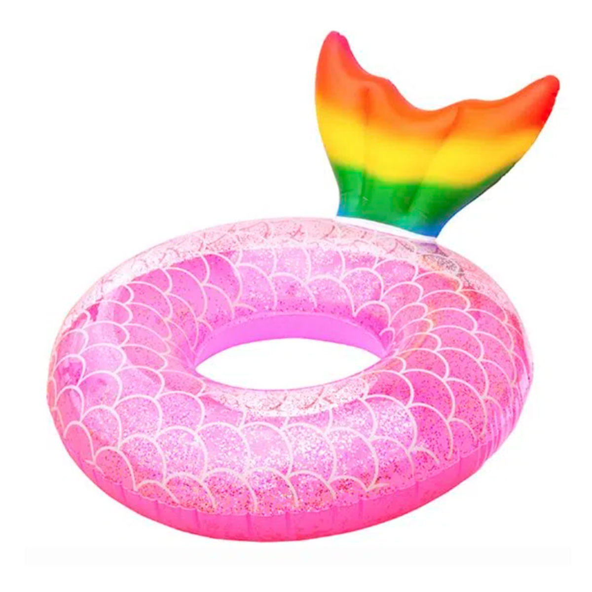 Flotador hinchable en forma circular con diseño de cola de sirena y con purpurina. Perfecto para relajarte cómodamente en la piscina o en el mar mientras disfrutas del sol y del movimiento del agua. Serás la envidia de la playa.