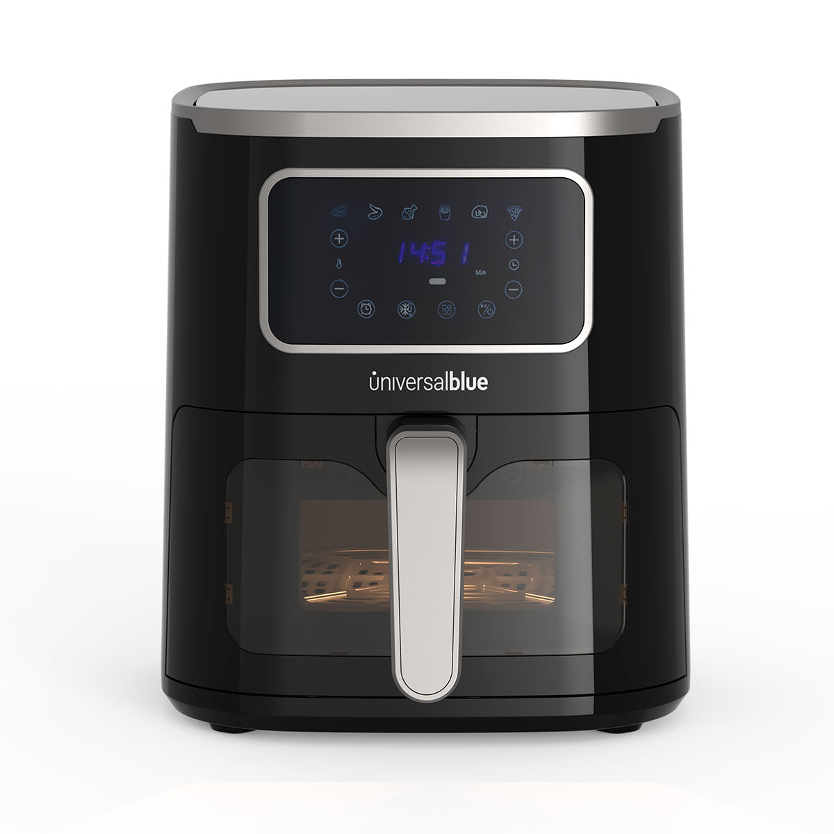 Con la freidora de aire Air Crispy 6005B de la marca Universal Blue podrás disfrutar de una comida más sana y deliciosa en menos tiempo. Se trata de una freidora muy potente de 1450W y con una gran capacidad de 5L. Por lo tanto, nos encontramos con una freidora que te permitirá cocinar una gran cantidad de alimentos, por lo que es ideal para hogares con muchos miembros o donde se haga un uso muy recurrente de esta. En la parte superior se encuentra el panel digital donde podrás seleccionar entre sus 6 recetas preinstaladas, ajustar la temperatura o el temporizador. Bajo este se encuentra el tanque con asa de tacto frío. El tanque dispone de un cristal transparente que te permitirá ver el estado de los alimentos sin necesidad de abrir el compartimento. La freidora viene con 1 bandeja de Ø15,3 cm, 1 brocha para pintar los alimentos y 1 paleta para retirarlos. Patatas, verduras, carnes, ¡incluso postres! Con esta freidora Air Crispy 6005B podrás cocinar en pocos minutos para preparar suculentas comidas y cenas. ¡Hazte con la tuya al mejor precio en Embargosalobestia!