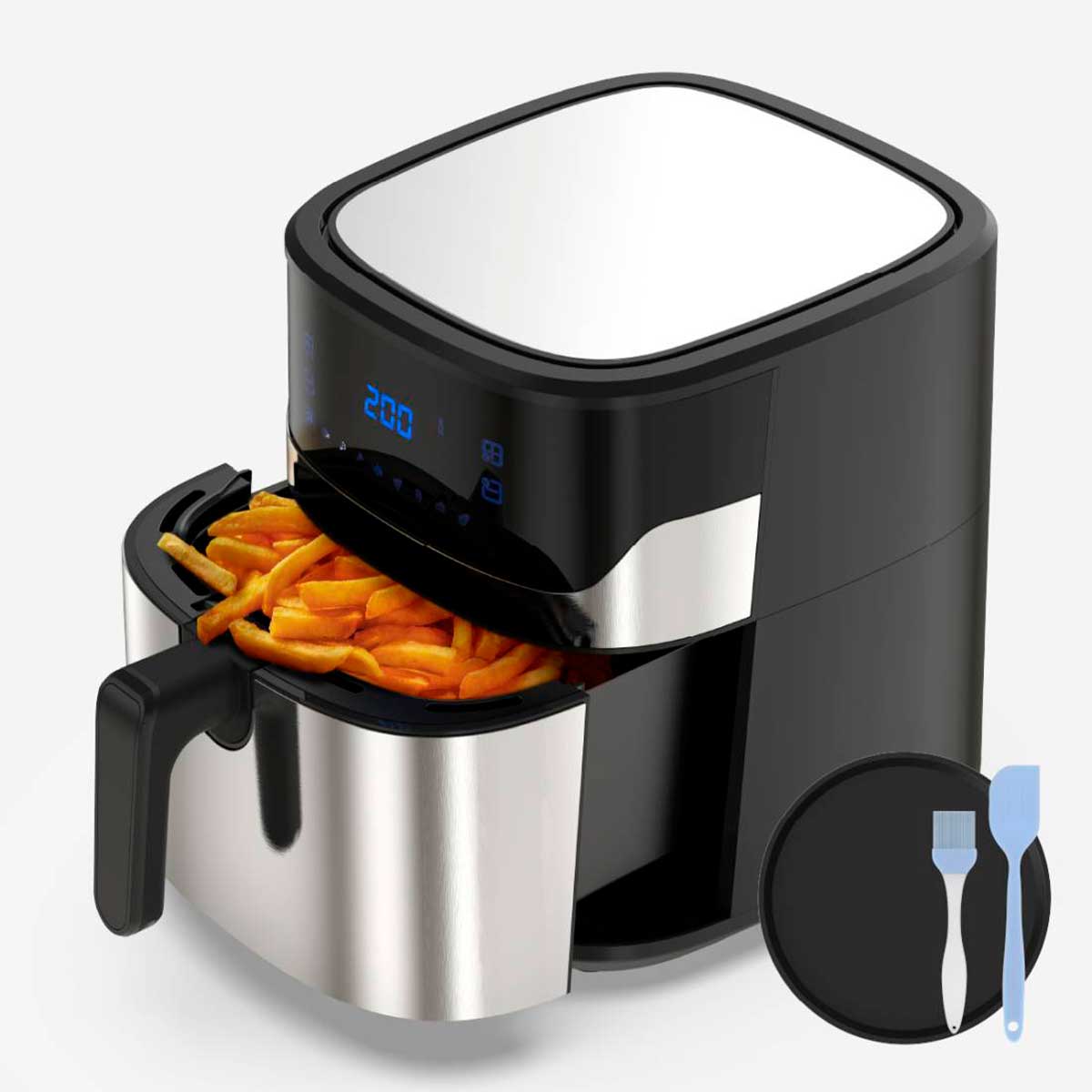 Con la nueva freidora de aire Air Crispy 6006B de Universal Blue no hay barreras para la imaginación. Con su potencia de 1600W y una generosa capacidad de 6,5 litros, esta freidora es perfecta para preparar deliciosas recetas para hasta 5 personas. ¿Listo/a para cocinar de manera más saludable y deliciosa? Con su intuitivo control táctil, puedes ajustar la temperatura y el temporizador a tu gusto. ¿Quieres controlar todos los parámetros? ¡No hay problema! El temporizador de hasta 60 minutos te permite cocinar de manera rápida y controlada. Además, cuenta con 8 recetas preinstaladas para que tu creatividad culinaria no tenga límites. El revestimiento antiadherente facilita la limpieza y garantiza que tus platos se deslicen perfectamente, sin preocuparte por los alimentos pegados. ¿Qué hace que esta freidora sea realmente especial? Cocina de forma más saludable, sin aceite, conservando el sabor y la textura de tus alimentos favoritos. ¡Olvídate de las grasas innecesarias y disfruta de comidas deliciosas! Además, viene con una serie de accesorios para que dispongas de todo lo necesario para preparar recetas tanto dulces como saladas. ¿A qué esperas? ¡Descubre un mundo de posibilidades culinarias con la Air Crispy 6006B de Universal Blue!