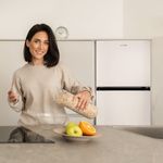 Con una capacidad total de 300L, de los cuales 230 corresponden al frigorífico y 70L al compartimento de congelador, este frigorífico cuenta con un compartimento superior de congelador que facilita el acceso rápido a los productos congelados, mientras que la parte inferior dispone de un amplio espacio de refrigeración con 4 estantes ajustables y 1 cajón especial para frutas y verduras, garantizando que los alimentos se mantengan frescos durante más tiempo. Además, el compartimento del frigorífico dispone de 3 balconeras para que no falte espacio de almacenamiento.